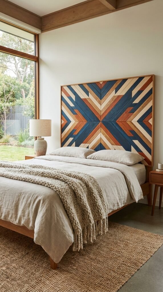 Opt for a carved wooden headboard with geometric patterns or upholster it in a bold print. This piece becomes the centerpiece of the room, grounding the bed area.