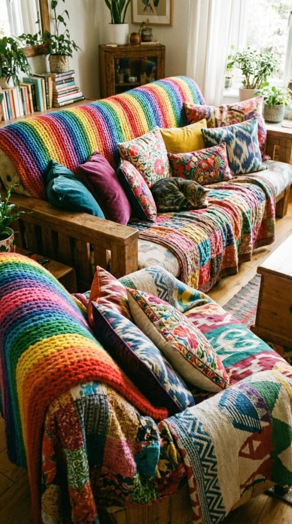 patterns. These textiles add cultural richness and a pop of color. Pair with velvet cushions in complementary shades for extra depth.