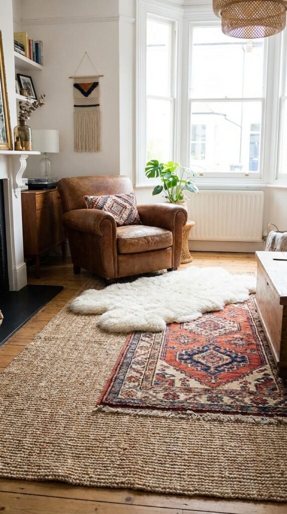Layer a jute rug with a kilim runner or African mud cloth for a mix of textures and patterns. This creates visual interest underfoot while keeping the space grounded.