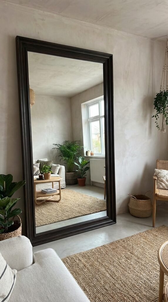 Why it works: The reflective surface brightens the room, while the natural frame ties into the Afrohemian theme. Place opposite a window for maximum impact.