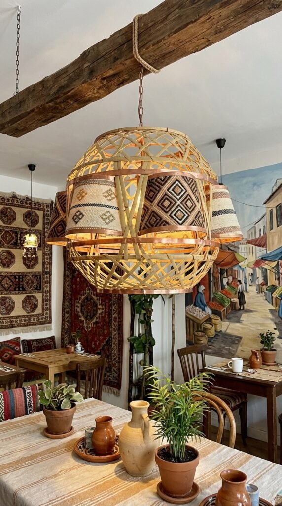 Choose a beaded chandelier or woven pendant light for a cultural statement. These fixtures become conversation pieces while illuminating the room.