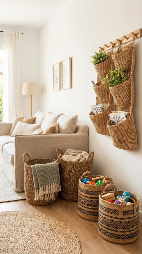 Incorporate woven baskets in various sizes for storage. These functional decor pieces add texture and keep the space organized.