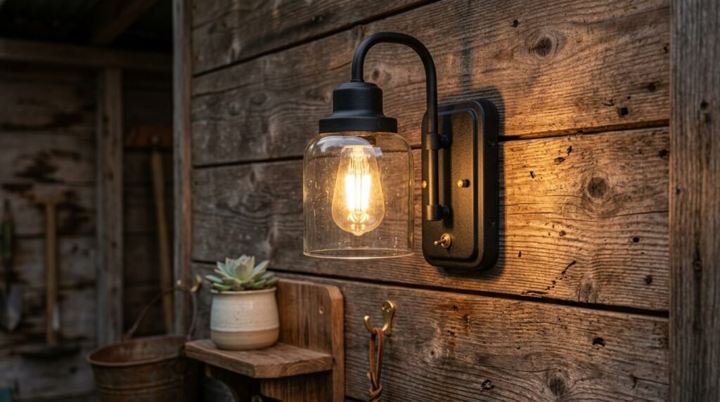 Most budget sheds lack electrical wiring. To avoid the high cost of an electrician, utilize “off-grid” lighting. Battery-powered LED wall sconces or rechargeable “puck” lights hidden inside vintage lamp shades provide a high-end look without the need for outlets.