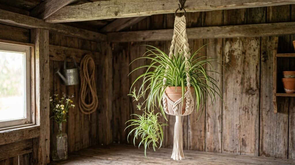 Hanging plants in corners “softens” the sharp 90-degree angles of the shed walls, making the environment feel more organic and less like a storage box. Use simple terracotta pots to maintain a natural, budget-friendly color palette.