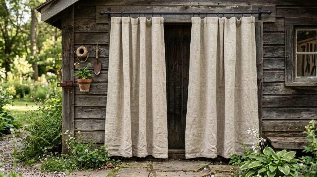 Sheds are prone to drafts. A low-cost “pro” trick is to use heavy textiles as functional insulation. Hanging floor-to-ceiling canvas or thick linen curtains over the door and windows blocks drafts and dampens outdoor noise (like lawnmowers or wind).