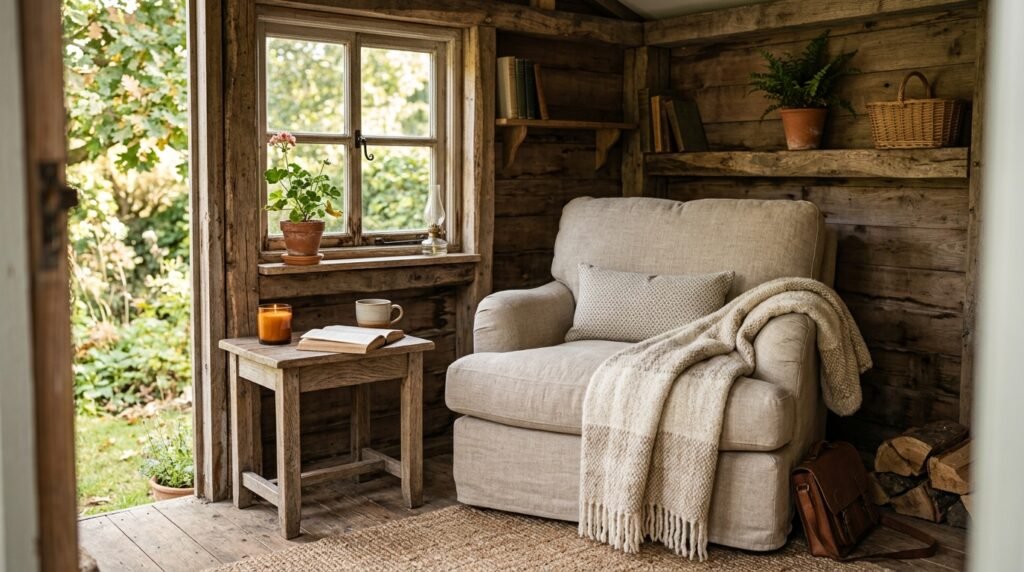 In a confined space like a shed, the chair is the primary architectural element. To stay on budget, source a “hero” chair from local marketplaces or thrift stores. Look for high-backed armchairs or wingbacks that provide head support for long reading sessions.