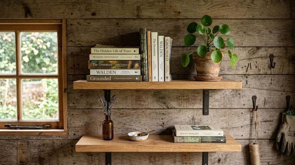 Install the shelves at varying heights to create visual movement. Keep the “active” reading list at eye level and use the higher shelves for decorative objects or battery-operated lanterns. This keeps the floor clear, making a 6×6 or 8×8 shed feel significantly more spacious.