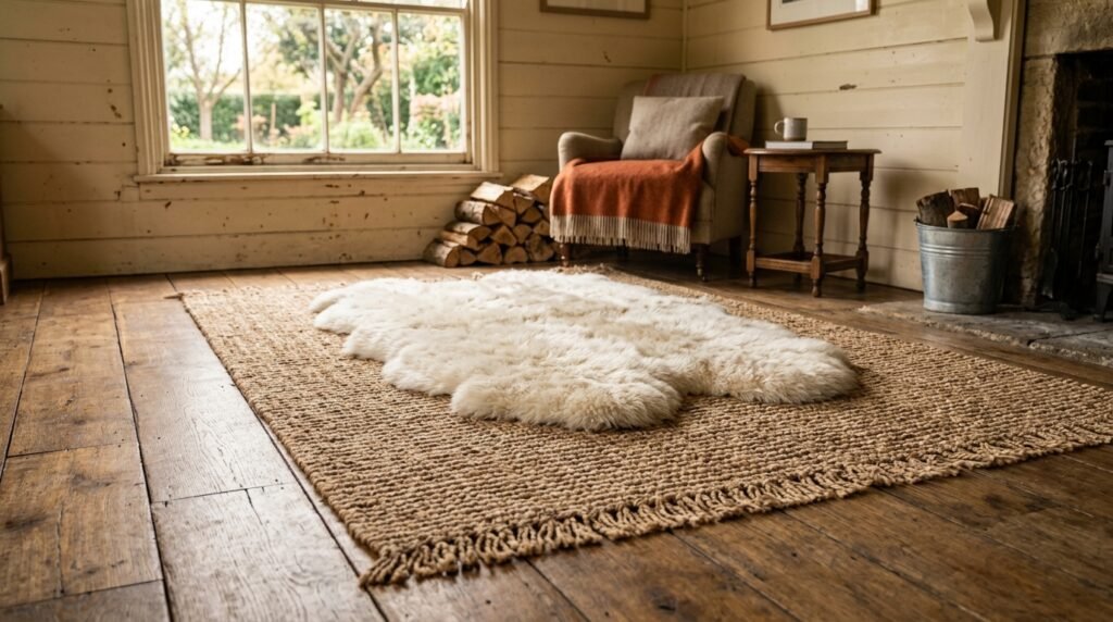Shed floors are often cold and made of basic plywood. Visual and thermal warmth can be added instantly through “zonal” rug layering. A large jute or sisal rug ($30) acts as a durable, earthy base that covers the industrial floor.