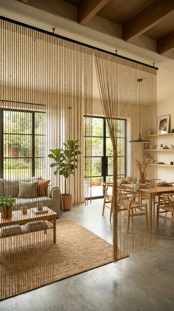 In open-plan spaces, bamboo beaded curtains act as a graceful room divider without blocking light. Hang them from a metal track at ceiling height to define areas while maintaining an airy flow. Pair with Scandinavian furniture and a jute rug for a cohesive look.