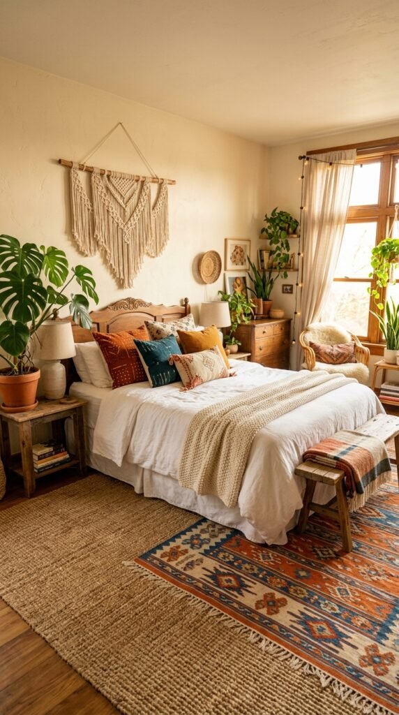 Balance the vibrancy of the headboard with neutral bedding in white or cream, and add texture with knit throw blankets and embroidered pillows. Incorporate rattan or bamboo furniture pieces to maintain the boho aesthetic.