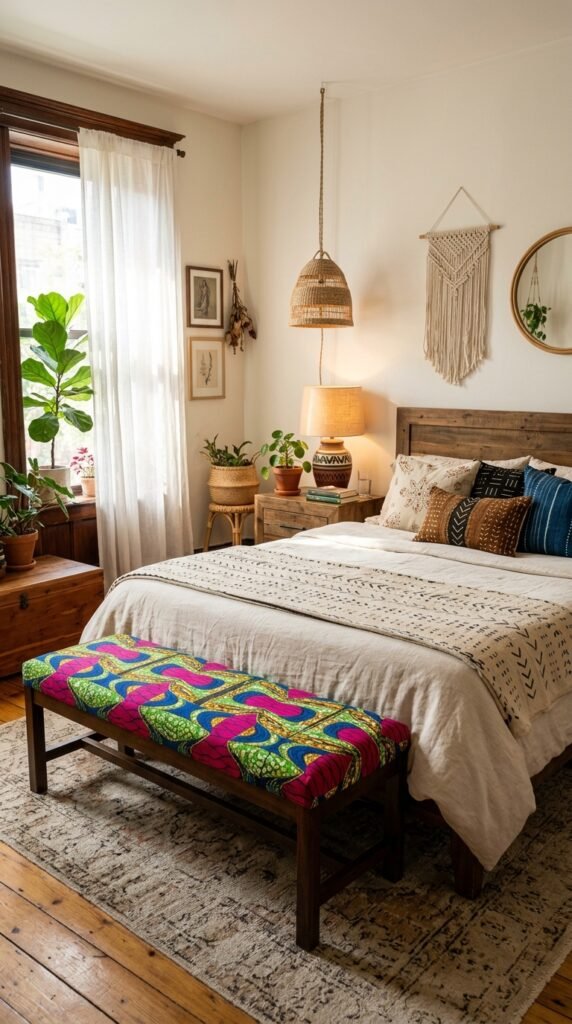 Add a custom upholstered bench to the foot of your bed, featuring African print fabric in a bold pattern. Choose a design with colors like fuchsia, lime green, and royal blue to create a sense of drama and sophistication. This not only provides additional seating but also adds a pop of color and texture to the space.