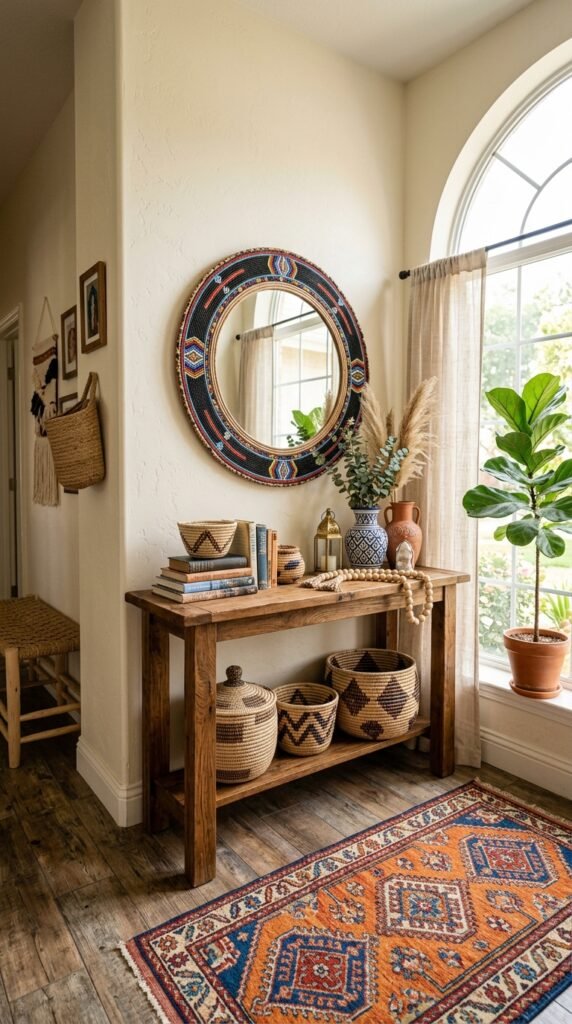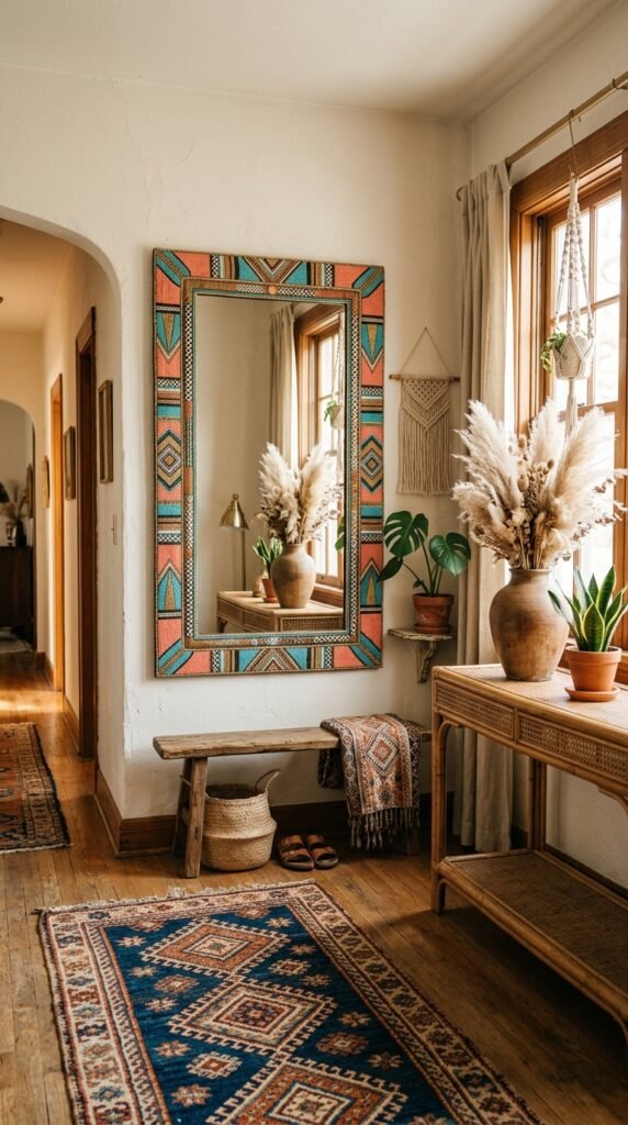 Style the area around the mirror with a rattan console table, a ceramic vase filled with dried pampas grass, and a patterned runner rug. This creates a warm and inviting entryway that sets the tone for the rest of your home.