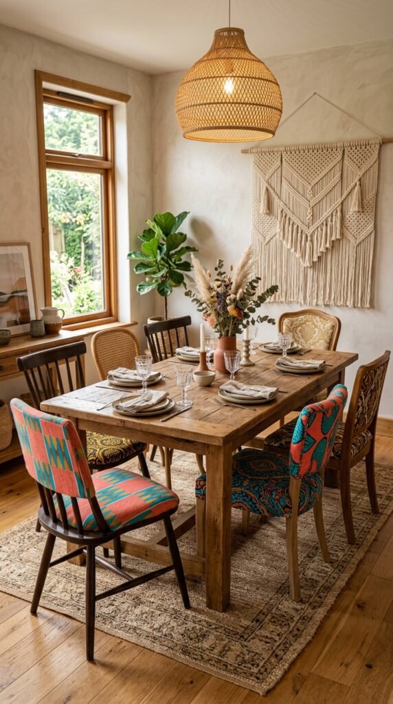 Pair the lighting with a wooden dining table and rattan chairs to enhance the boho vibe. Add a macramé wall hanging and a patterned rug to create a cohesive, globally inspired space.