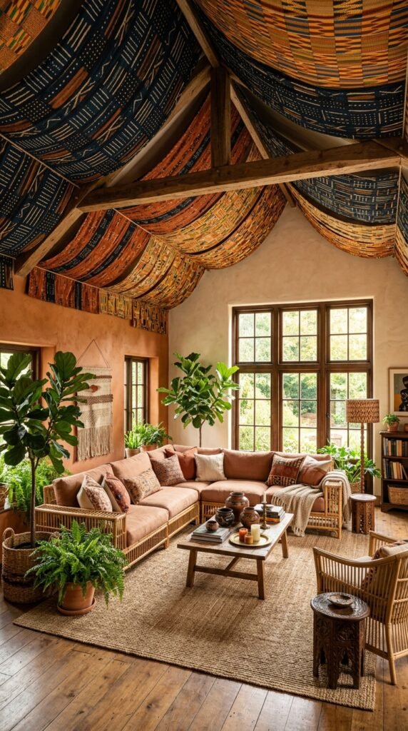 Create a dramatic focal point by draping a large-scale African print fabric from the ceiling, allowing it to cascade down one wall. Choose a fabric with a bold geometric pattern in indigo and saffron to add depth and visual interest. This technique not only draws the eye upward, making the room feel larger, but also infuses the space with a sense of movement and energy.