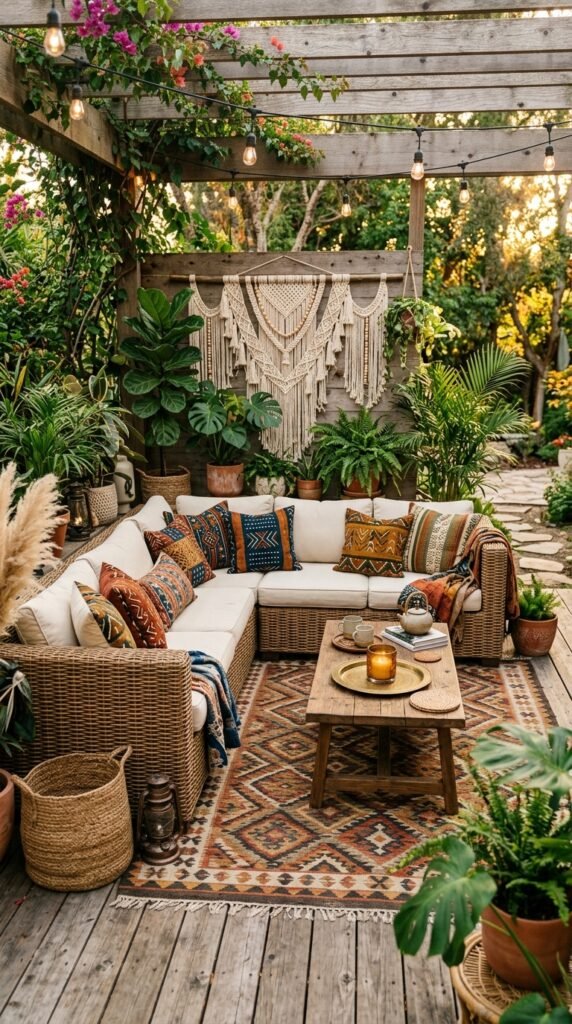 Create a boho chic outdoor lounge area with African-inspired textiles and decor. Start with a rattan sectional sofa and top it with African print throw pillows in colors like coral, turquoise, and gold. Add a patterned outdoor rug and a macramé wall hanging to create a sense of texture and movement.