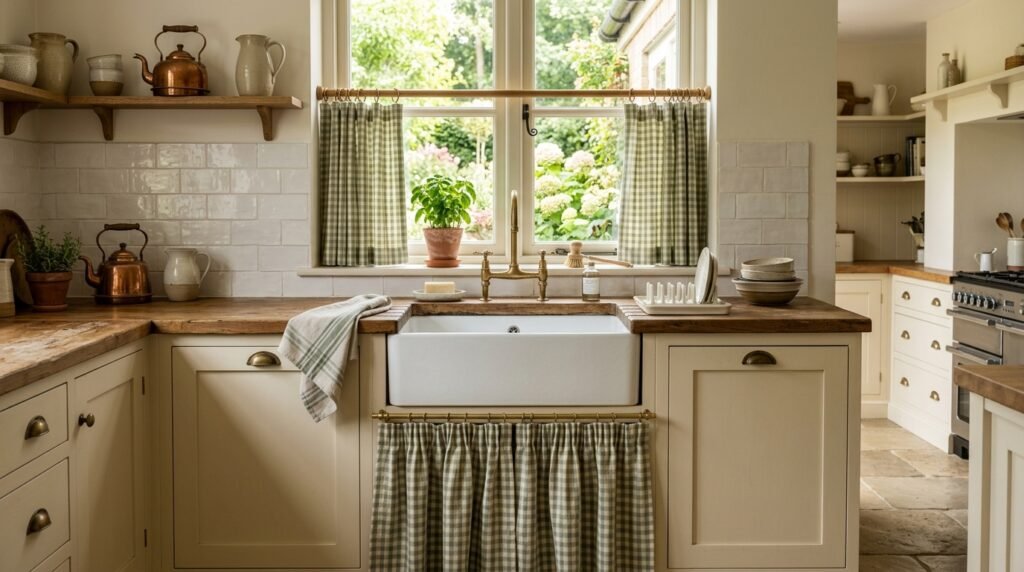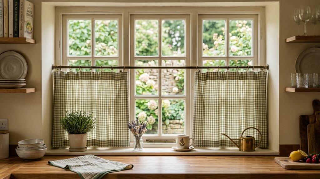 Cafe curtains—traditionally covering only the lower half of a window—are a functional design tool used to balance privacy with natural light. In a cottage-style interior, they provide a “softened” architectural line, breaking up the hard edges of window frames while introducing texture and pattern.