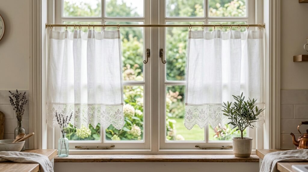 - Lace Insets: Adding a strip of crochet or eyelet lace to the bottom edge allows extra light to “sparkle” through the hem, a signature detail of European cottage style.