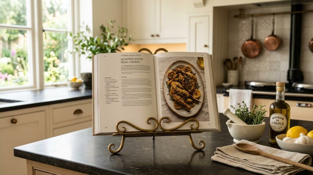 A brass or wooden cookbook stand adds a layer of intellectual “coziness.” Even if you aren’t cooking, displaying a beautifully photographed book adds a sophisticated, lived-in feel to the counter, suggesting the kitchen is a place of creativity.