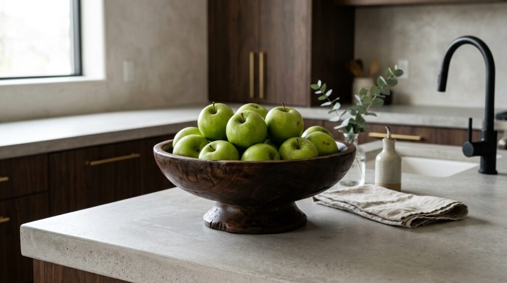 Move away from basic wire baskets. A footed stone or wooden bowl acts as a piece of sculpture. Filling it with a single type of fruit (e.g., all lemons or all green apples) creates a “monochromatic” pop of color that looks curated rather than accidental.