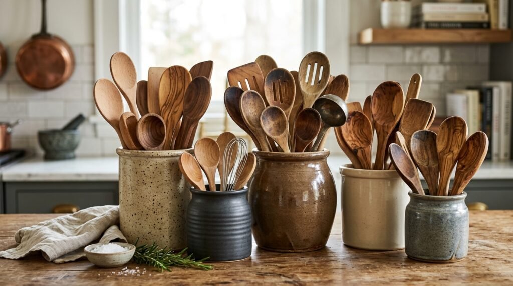 Utensil crocks are a necessity, but they can be a design feature. Choose hand-thrown ceramics with interesting glazes. Grouping two or three vessels of varying heights—one for wood, one for metal—creates a “still life” that adds a sense of “soul” and craftsmanship to the kitchen.