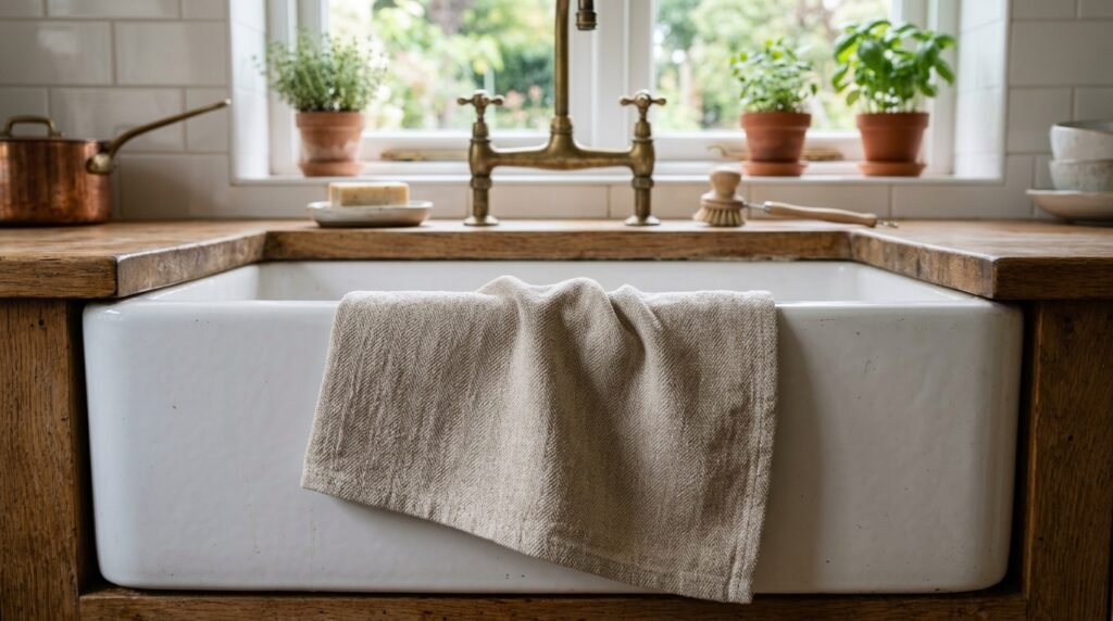 A high-quality linen or waffle-knit tea towel draped over the sink or a handle provides a “soft” surface against the hard “stone” of the kitchen. Choose neutral, earthy tones like sage, ochre, or charcoal to add a layer of tactile comfort and “soften” the room’s acoustics.