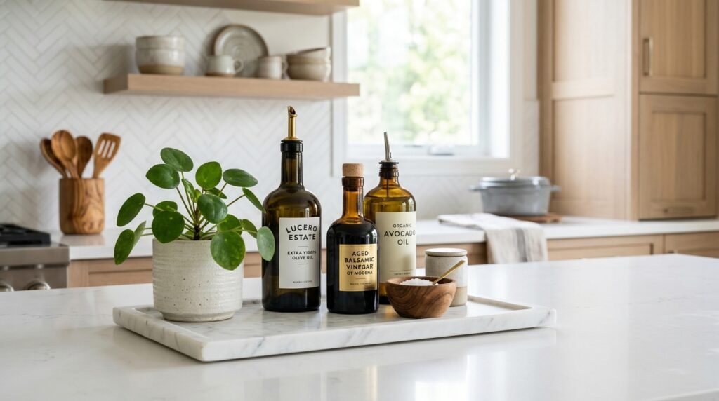 Visual noise is often caused by small items scattered across the counter. Use a pedestal or tray (in marble, wood, or brass) to group daily essentials like salt cellars and olive oil. This “zones” the items, turning “clutter” into a “collection” and making the counter significantly easier to clean.