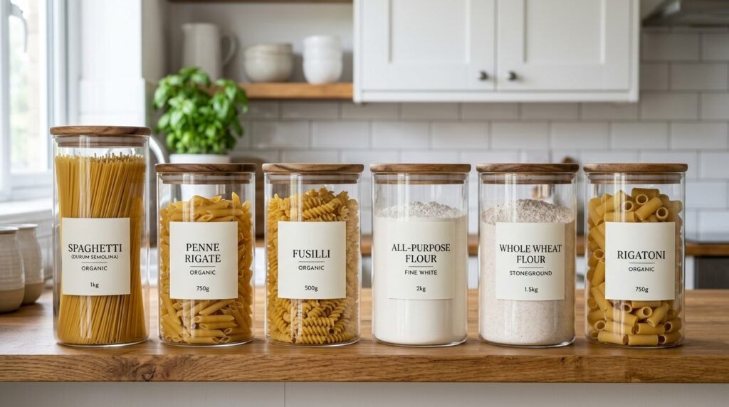 Mismatched grocery packaging is a major source of visual stress. Decanting dry goods like pasta, flour, or coffee into uniform glass or ceramic jars creates a clean, rhythmic line. This simplifies the color palette of the counter and reinforces a sense of high-end organization.