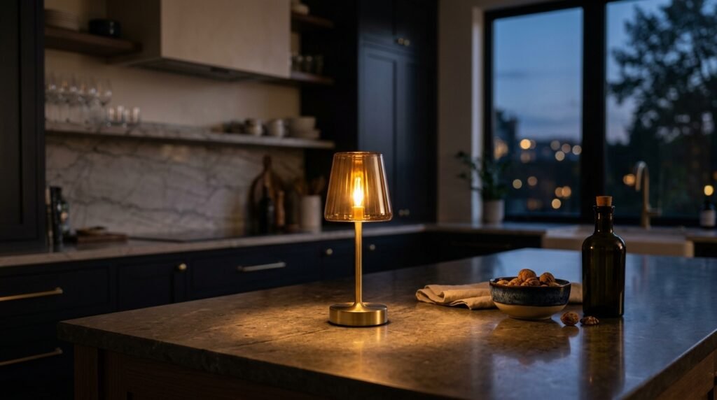 One of the biggest “pro” secrets is adding a small lamp to the counter. A cordless, rechargeable LED lamp with a fabric or pleated shade provides a soft, localized glow that “big lights” cannot achieve. It makes the kitchen feel like an extension of the living room in the evening.