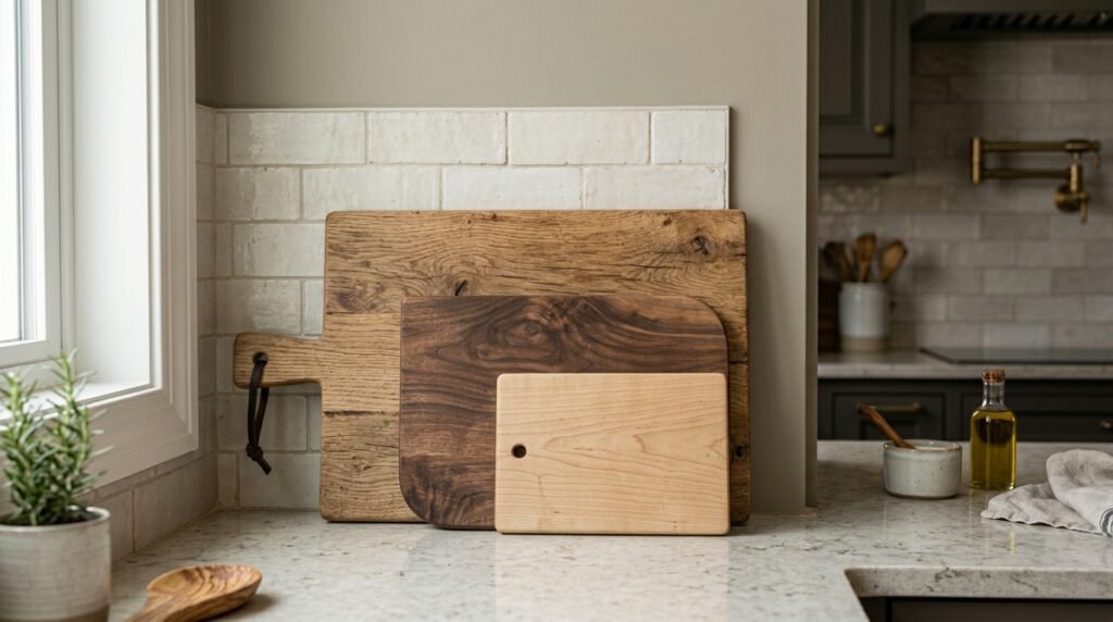 Instead of storing boards in a cabinet, lean a collection of three varied shapes (round, rectangular, and oversized) against the backsplash. This introduces a large block of natural wood texture, which instantly warms up cold stone or tile surfaces. It also provides a functional “backdrop” for other smaller decor items.