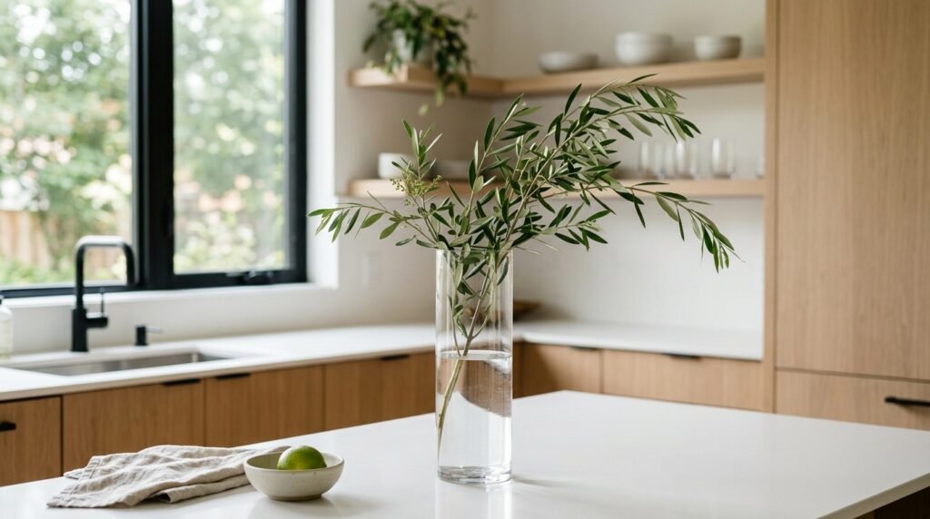 Small plants can look messy in a busy kitchen. A single, oversized branch (olive, eucalyptus, or maple) in a heavy ceramic or glass vase provides “architectural height.” This draws the eye upward, emphasizing the vertical space and adding a vibrant living element that feels intentional.