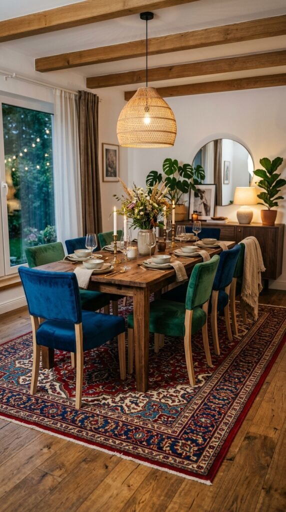 A statement rug can instantly elevate a room, especially when paired with simpler furnishings. Choose an oversized Persian rug with intricate patterns and rich colors to anchor your dining area. Layer it under a wooden dining table to allow the rug’s design to shine while protecting high-traffic areas.