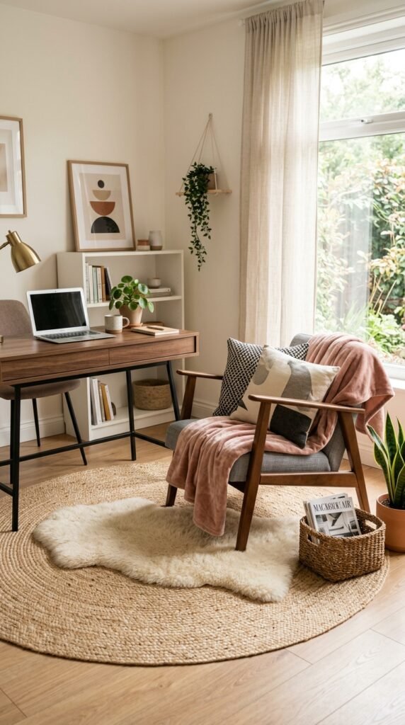 Break away from traditional rectangles by incorporating circular rugs or irregular shapes. Layer a circular jute rug under a rectangular sheepskin rug in your home office for a playful contrast. This unexpected combination adds a modern twist to the space.