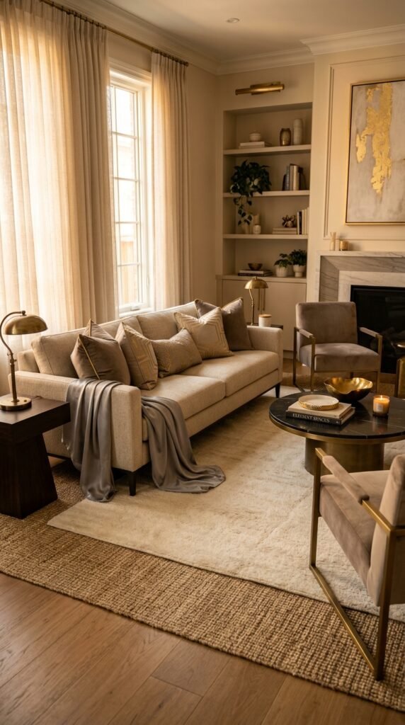 Neutral tones provide a serene base, but adding metallic accents elevates the look. Layer a cream wool rug over a larger sisal rug, then introduce cushions with gold detailing. A silk throw in soft gray adds a touch of elegance without overwhelming the palette.