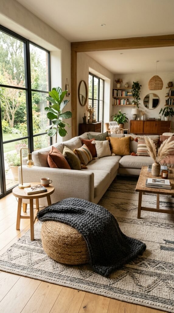 In open-plan spaces, throws can help define specific zones. Drape a chunky knit throw over a floor pouf to create a cozy reading corner within a larger living area. This simple addition visually separates the space without the need for walls or dividers.