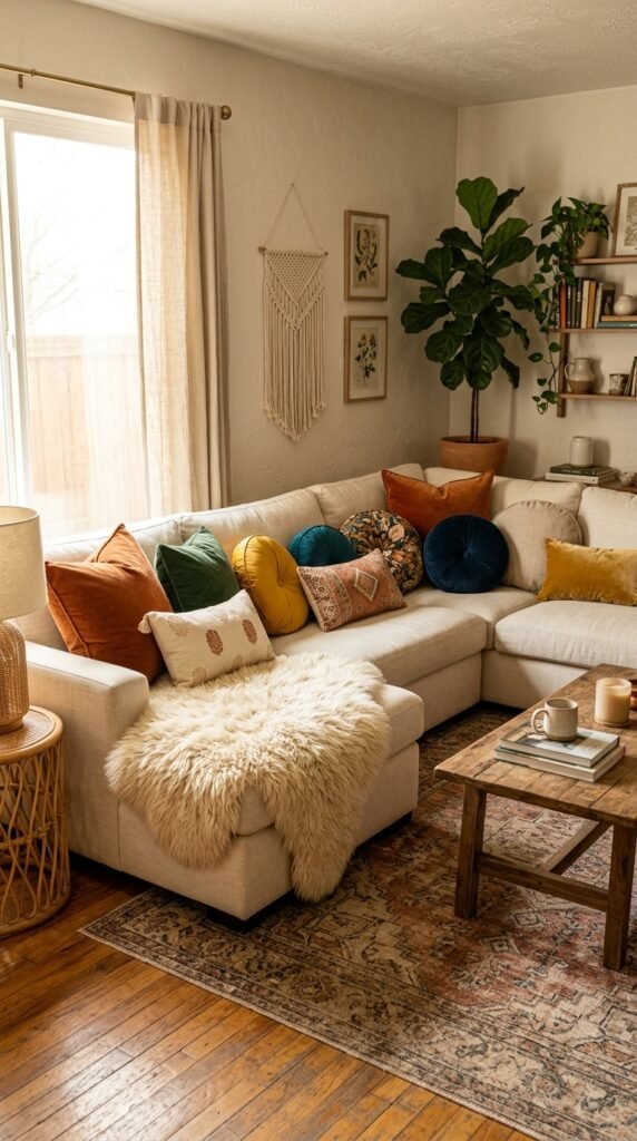 Mixing cushion sizes and shapes adds dimension to your seating area. Combine 24-inch square cushions with 18-inch round cushions and 12-inch lumbar pillows for a layered effect. Use a variety of fabrics like velvet, linen, and silk to enhance texture.