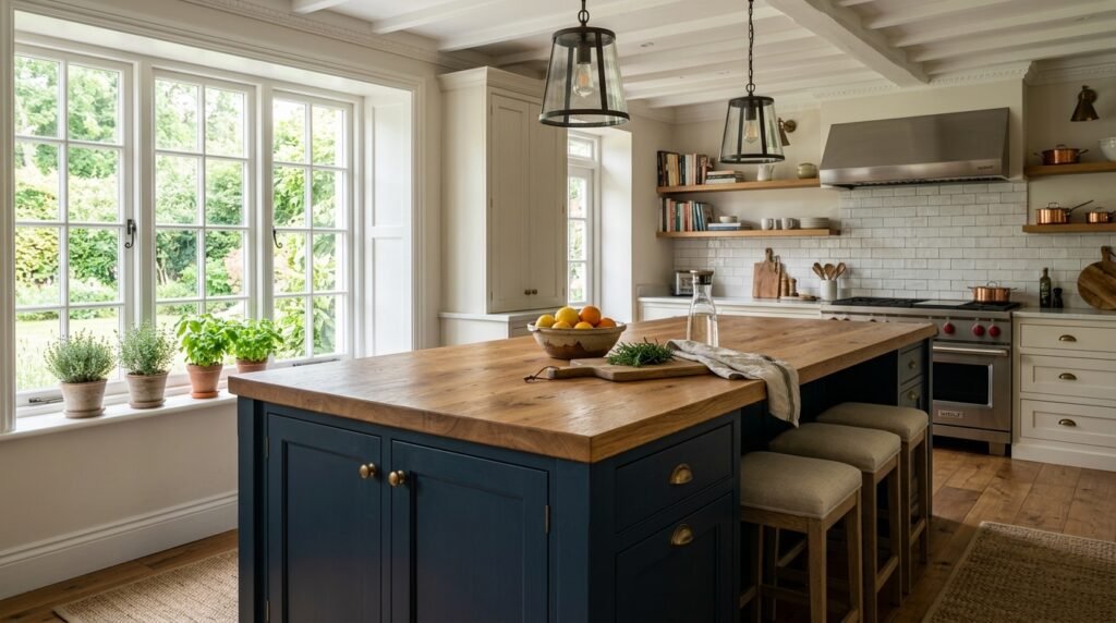 Because blue is a cool-toned color, it requires a “warm” counter-element to prevent the kitchen from feeling clinical. Natural wood is the most effective material for this purpose. Integrating oak, walnut, or reclaimed timber through flooring, open shelving, or a dedicated butcher-block island provides an organic balance to the dark cabinetry.