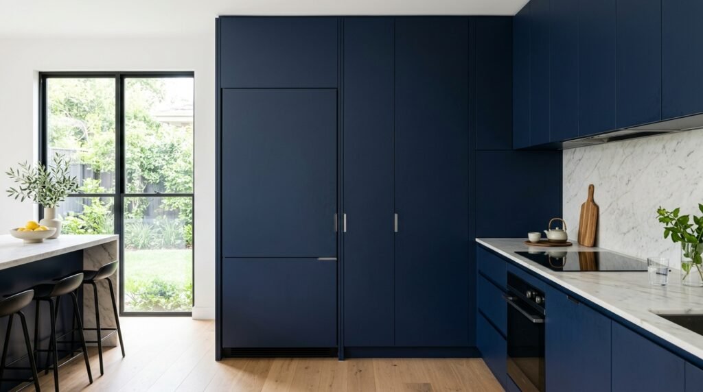 To maintain a high-end, moody aesthetic, many designers choose integrated appliances. By using cabinet panels to cover the refrigerator and dishwasher, the “blue” of the kitchen remains uninterrupted by large blocks of stainless steel.