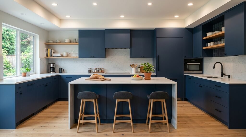 Successful dark kitchen design relies on the “cocoon effect”—using color to create a sense of permanence and quality. This guide outlines the practical steps for integrating deep blues into a functional kitchen environment.