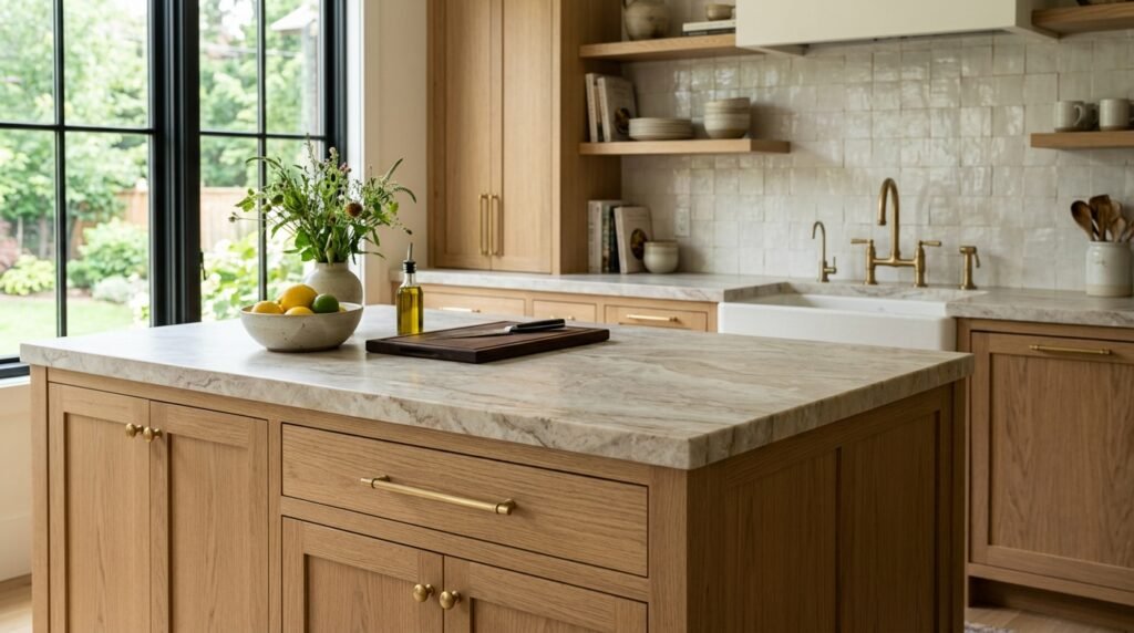 Natural stone is the most effective “partner” material for warm wood. Taj Mahal Quartzite or Honed Travertine are excellent choices because they offer an earthy, textured surface that mimics the organic origin of the cabinetry. The cool touch of the stone provides a sensory balance to the visual warmth of the timber.