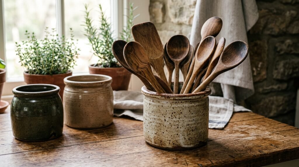 The final layer of a cozy kitchen comes from “soulful” objects. Hand-thrown ceramic canisters, vintage wooden dough bowls, and linen tea towels provide a sense of history. These items suggest that the kitchen has been curated over time, adding to the “lived-in” and authentic cottage-like atmosphere.