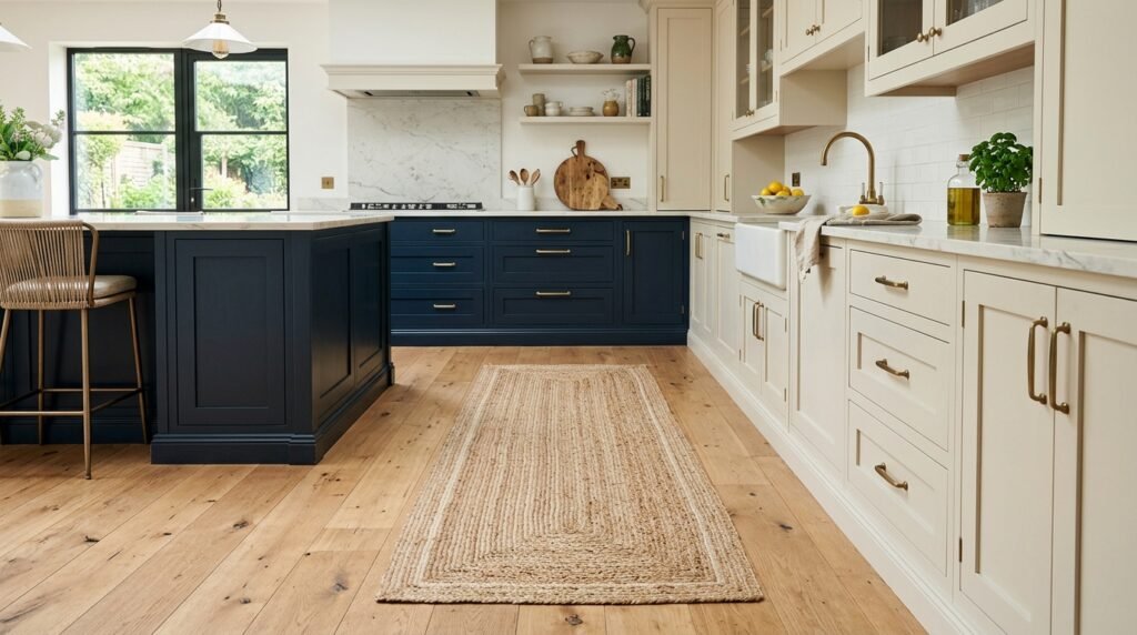To ground the wood cabinetry, use woven floor coverings like jute or seagrass runners. These materials provide a different type of “organic” texture underfoot. They are durable, easy to clean, and offer a rustic-modern feel that bridges the gap between high-end design and farmhouse comfort.