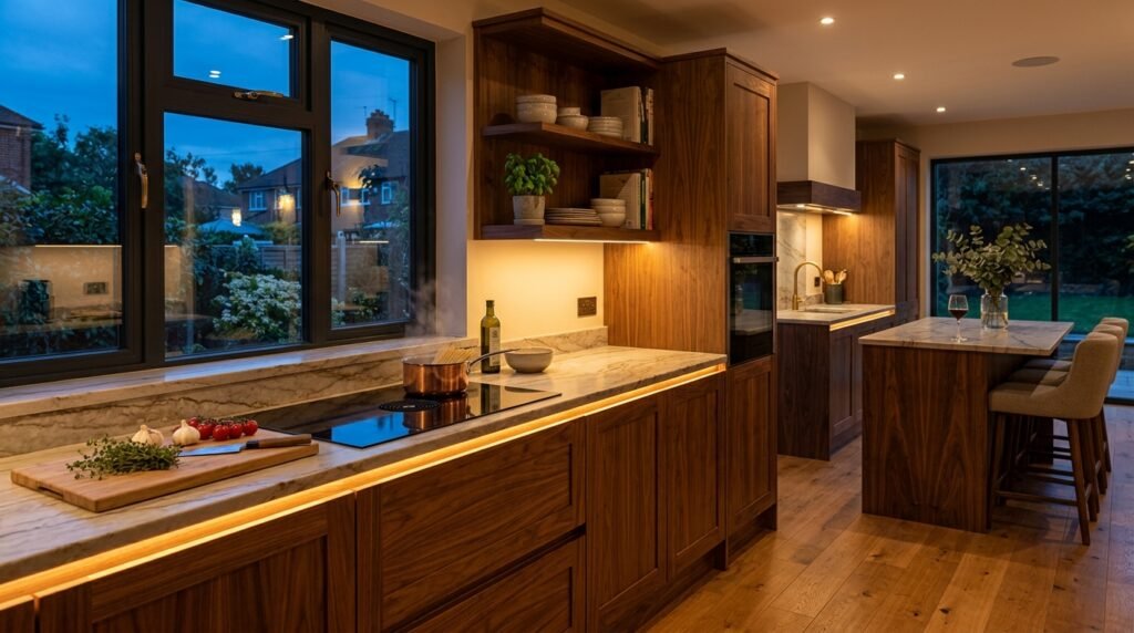 Lighting is the most critical technical factor in a wood kitchen. Cool-toned bulbs (4000K+) will make warm wood look “muddy” or grey. Using 2700K Warm White bulbs enhances the gold and amber tones within the grain, creating a “golden hour” glow that is essential for a cozy evening environment.