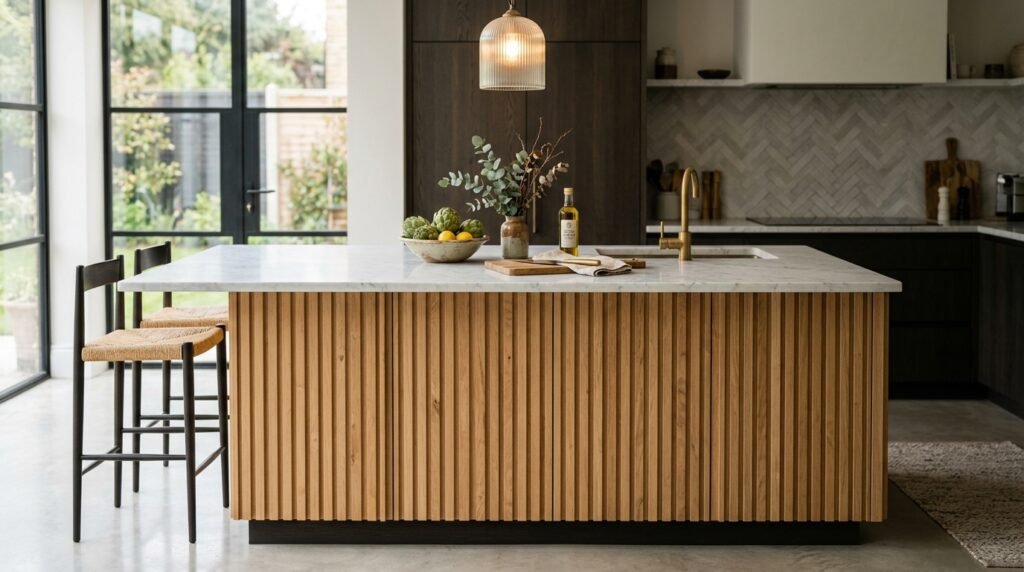 Adding vertical wood slats (tambour) to an island base or a specific cabinet section introduces architectural rhythm. These slats create a play of light and shadow that adds depth to the room without requiring additional colors or materials. This detail is particularly effective in modern-minimalist kitchens where “texture is the art.”
