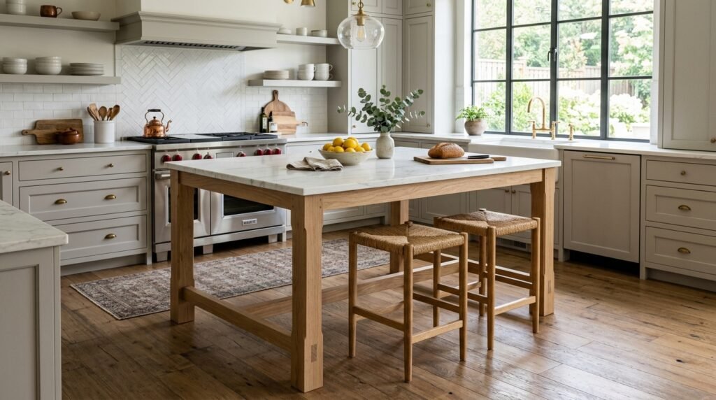 Treating the kitchen island as a piece of furniture—using legs instead of a solid plinth base—creates a sense of “airiness.” This allows for better light flow across the floor and prevents the wood tones from feeling overwhelming. A furniture-style island makes the kitchen feel more like a continuation of the living space.