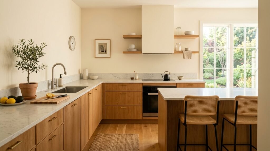 To prevent a wood-heavy kitchen from feeling too dark or “heavy,” pair it with cream or oatmeal tones. Unlike stark white, which can create a harsh contrast, cream shares a warm base with the wood. This “low-contrast” palette is essential for a soft, inviting aesthetic that feels balanced and airy during daylight hours.