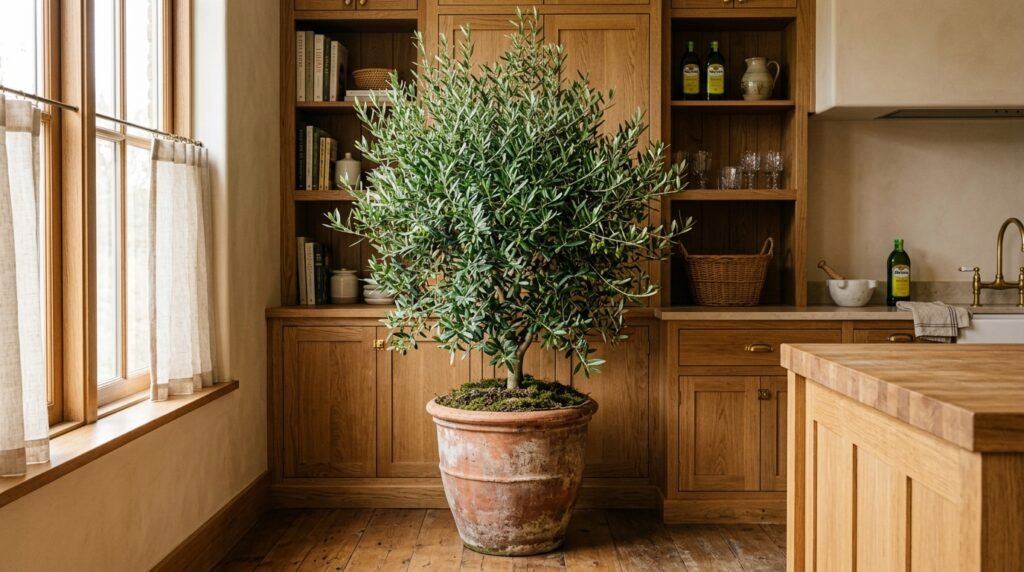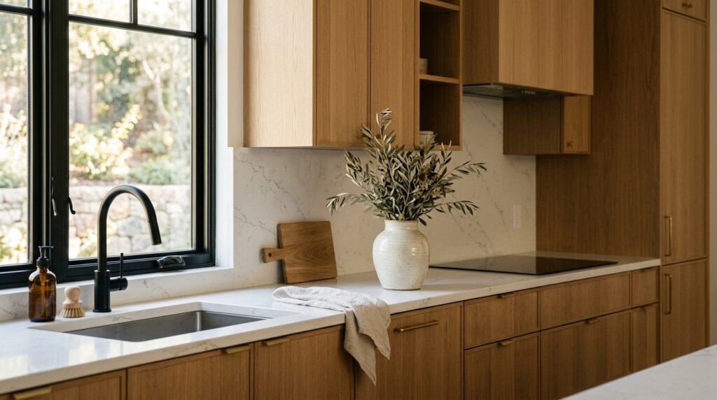 The presence of greenery is the final step in a natural kitchen aesthetic. The vibrant green of an olive tree or a trailing pothos provides a direct contrast to the brown and tan tones of the wood. This “living” element softens the hard lines of the cabinetry and reinforces the kitchen’s connection to the outdoors.