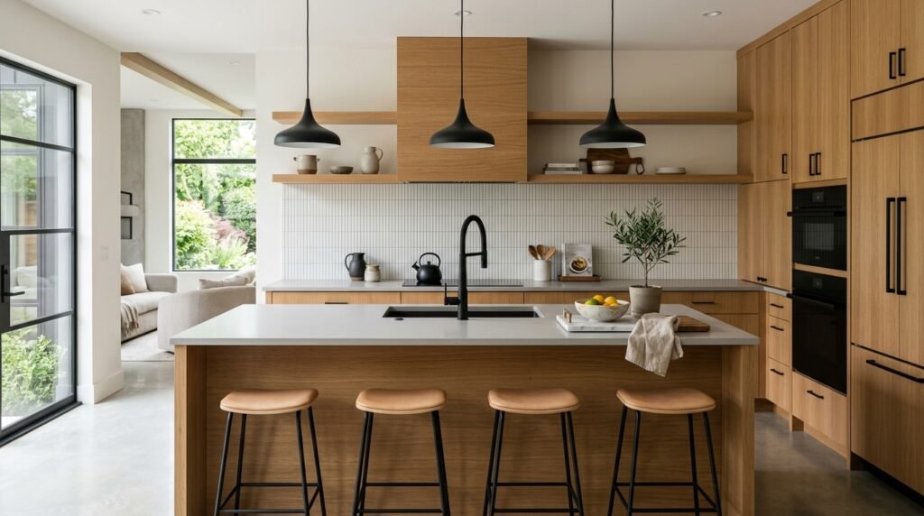 While the goal is a warm, natural look, a few “grounding” elements in matte black can prevent the room from looking too rustic. A matte black faucet or pendant light provides a sharp, modern frame that makes the wood grain look more intentional and “designed.”