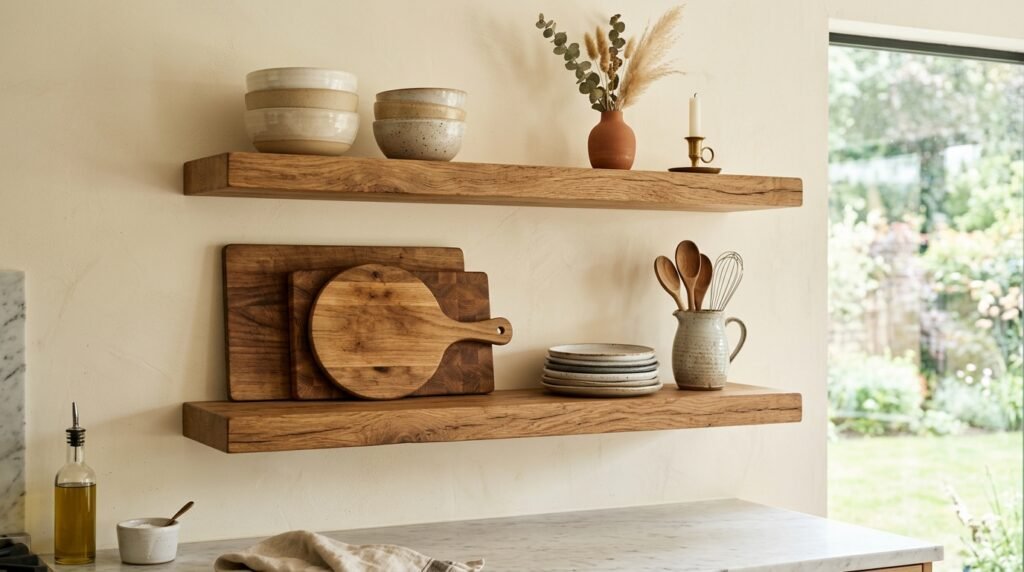 Replacing a portion of upper cabinets with thick, floating wood shelves creates a “visual break.” This allows for the display of functional ceramics, stoneware, and glass, which adds a layer of “lived-in” character. Open shelving makes the kitchen feel less like a showroom and more like a curated, working sanctuary.