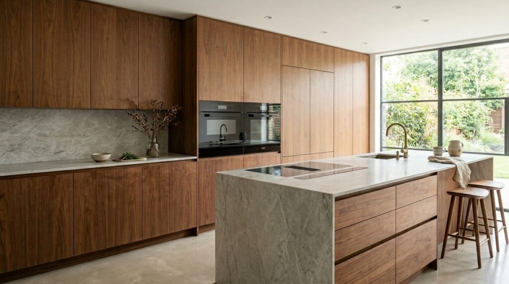 In a wood-focused kitchen, the grain is the focal point. To allow the beauty of the timber to be seen, maintain a strict “minimalist” approach to countertops. By removing appliances and clutter, you allow the eye to rest on the natural patterns of the wood and stone, resulting in a calmer, more restorative environment.