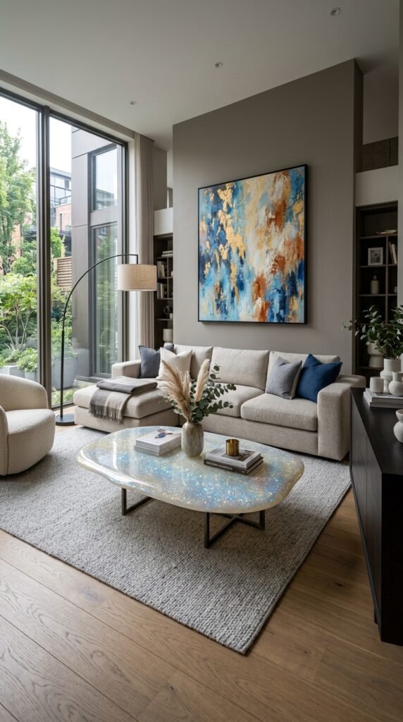 A coffee table with an opal resin top is both functional and artistic. Its smooth, glossy surface reflects the surrounding decor, creating a dynamic visual effect. Pair with a modular sofa and abstract art for a cohesive modern look.